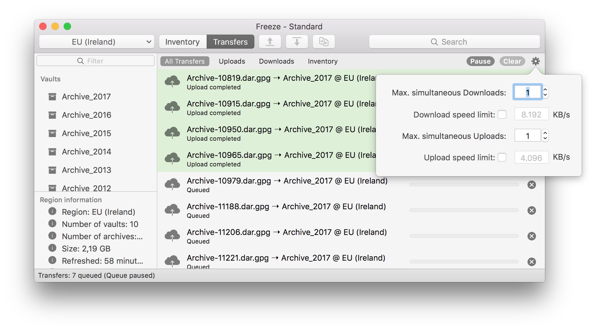 Switch to the "Transfer" tab to see the progress of your uploads. To throttle the transfer speed of your transfers, open the transfer settings by clicking on the gear icon.